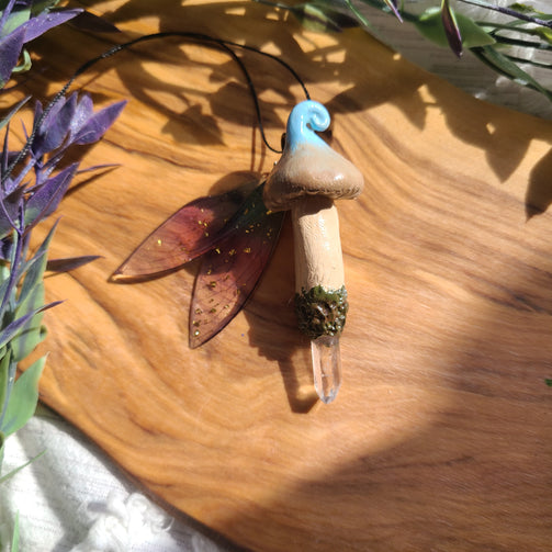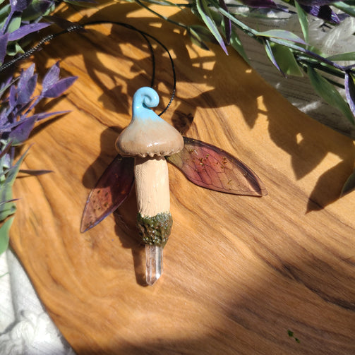 Fairy Wing Beach Blue Cap Mushroom Pendant with Lemurian Quartz