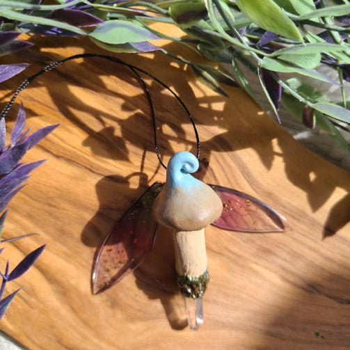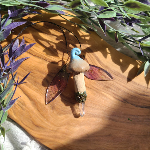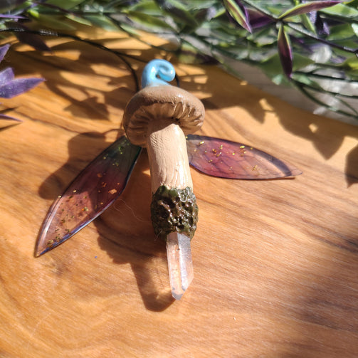 Hand Sculpted Beach Cap Polymer Clay Mushroom Pendant with Lemurian Quartz. Fairy wings are blue and pink. Mushroom is hand sculpted. Approximately 3 inches long. Includs a black adjustable macrame cord for hanging or wearing as a necklace. Ships within 1-2 days