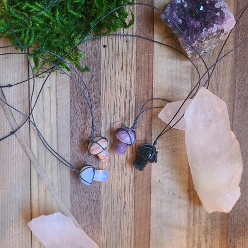 Crystal Mushroom wrapped in grey macrame cord. Necklace length is 20 inches at longest but is adjustable. Ships in 1-2 days.