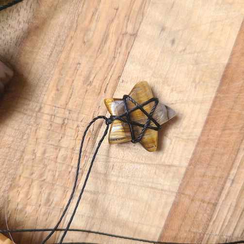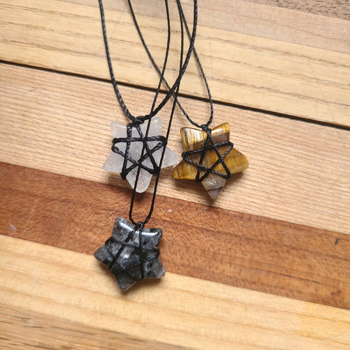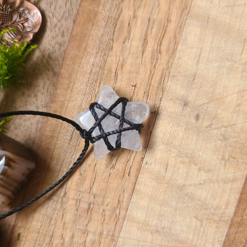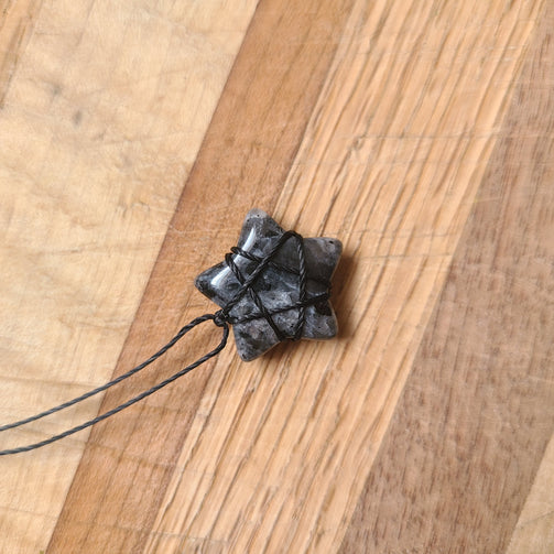 Crystal star wrapped in black macrame cord. Necklace length is 20 inches at longest but is adjustable. Ships in 1-2 days.