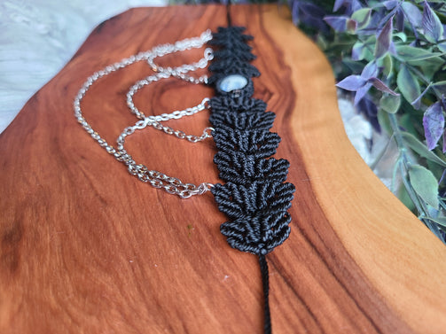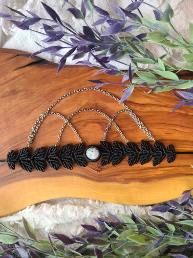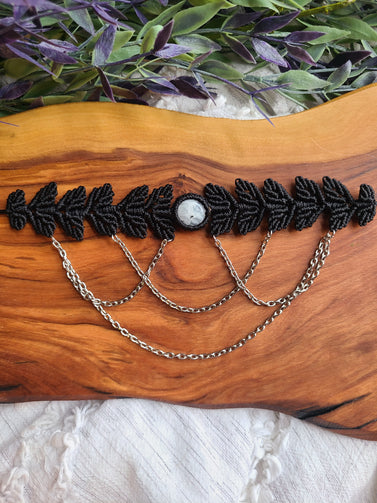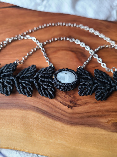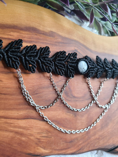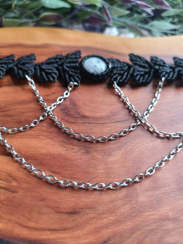 A beautiful and unique handmade leaf style choker featuring rainbow moonstone and delicate chains