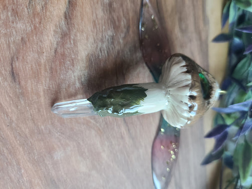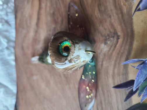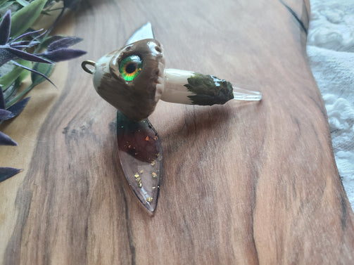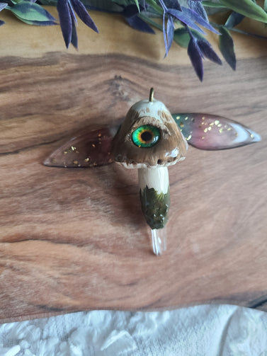 Hand Sculpted Brown and White Cap Polymer Clay Mushroom Pendant with LemurianQuartz. Fairy wings are blue and pink . Eye is glass and blue to green. Mushroom is hand sculpted. Approximately 3 inches long. Includs a black adjustable macrame cord for hanging or wearing as a necklace. Ships within 1-2 days