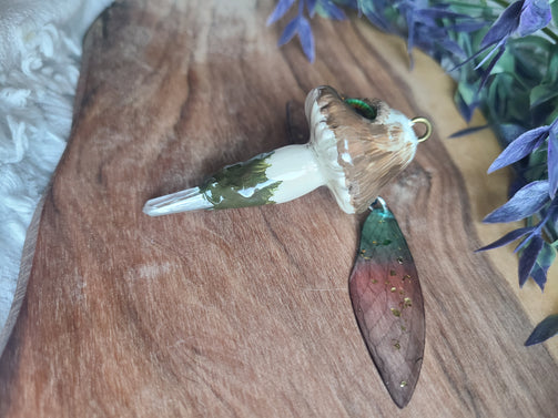 Fairy Wing Brown and White Cap Mushroom Pendant with Lemurian Quartz