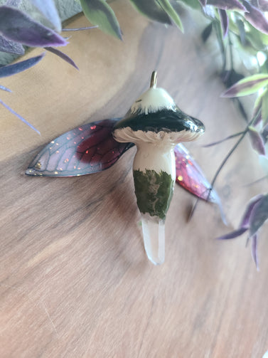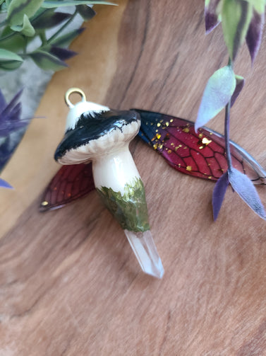 Fairy Wing Black and White Cap Mushroom Pendant with Lemurian Quartz