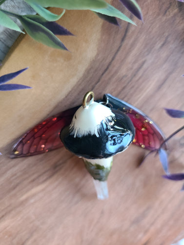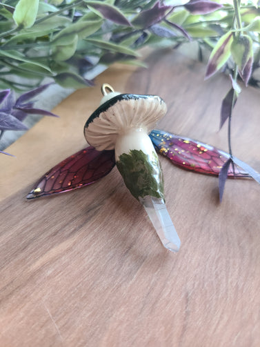 Hand Sculpted Black and White Cap Polymer Clay Mushroom Pendant with LemurianQuartz. Fairy wings are blue to purple. Mushroom is hand sculpted. Approximately 3 inches long. Includes a black adjustable macrame cord for hanging or wearing as a necklace. Ships within 1-2 days