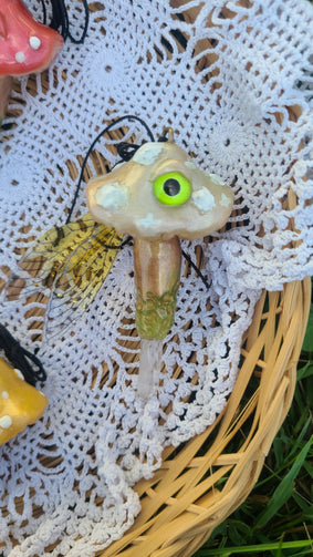 Hand Sculpted RedCap Polymer Clay Mushroom Pendant with Clear Quartz. Fairy wings are yellow. Eye is glass and green. Mushroom is hand sculpted. Approximately 3 inches long. Includes a black adjustable macrame cord for hanging or wearing as a necklace. Ships within 1-2 days