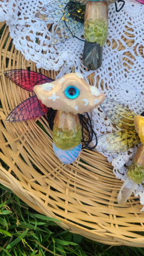 Hand Sculpted White Cap Polymer Clay Mushroom Pendant with Opalite. Fairy wings are blue to red . Eye is glass and blue. Mushroom is hand sculpted. Approximately 3 inches long. Includes a black adjustable macrame cord for hanging or wearing as a necklace. Ships within 1-2 days