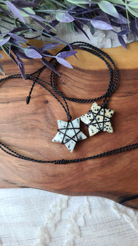 Crystal star wrapped in black macrame cord. Necklace length is 20 inches at longest but is adjustable.