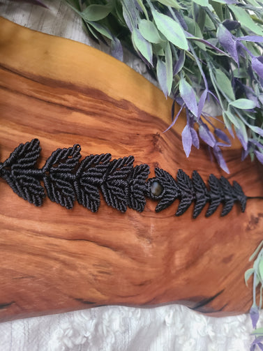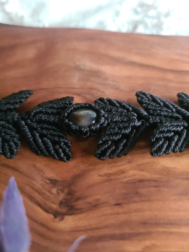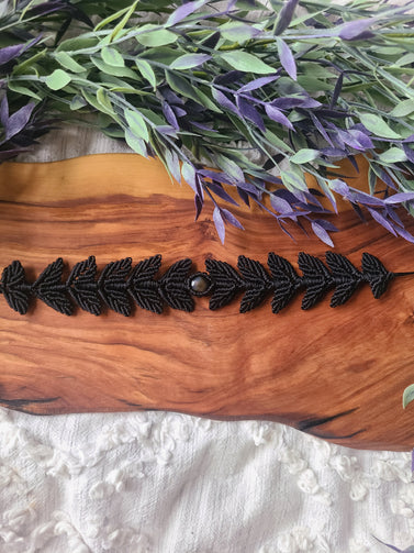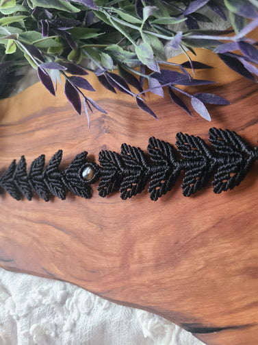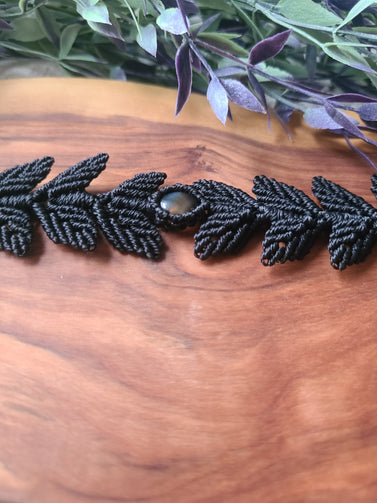 Beautiful handmade macrame leaf choker with a black agate crystal cabochon.