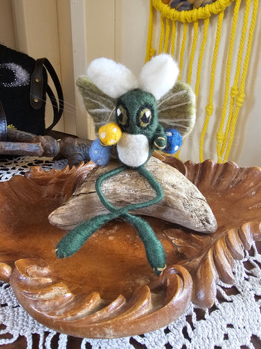 A moth or butterfly A frog? A An owl? This fantasy inspired handmade needle felted Green Forest Spirit is out to seek adventure in their new home.