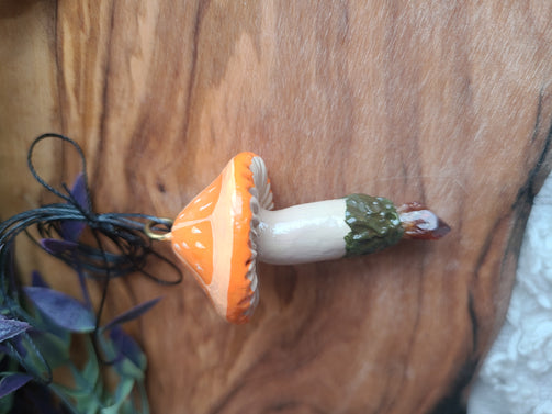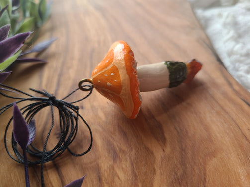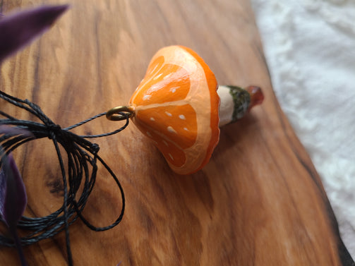 Hand Sculpted Orange Polymer Clay Mushroom Pendant withCitrine(heat treated). Mushroom is Hand Painted. Approximately 2.5 inches long. Mushroom comes with an adjustable cord. Ships within 1-2 days